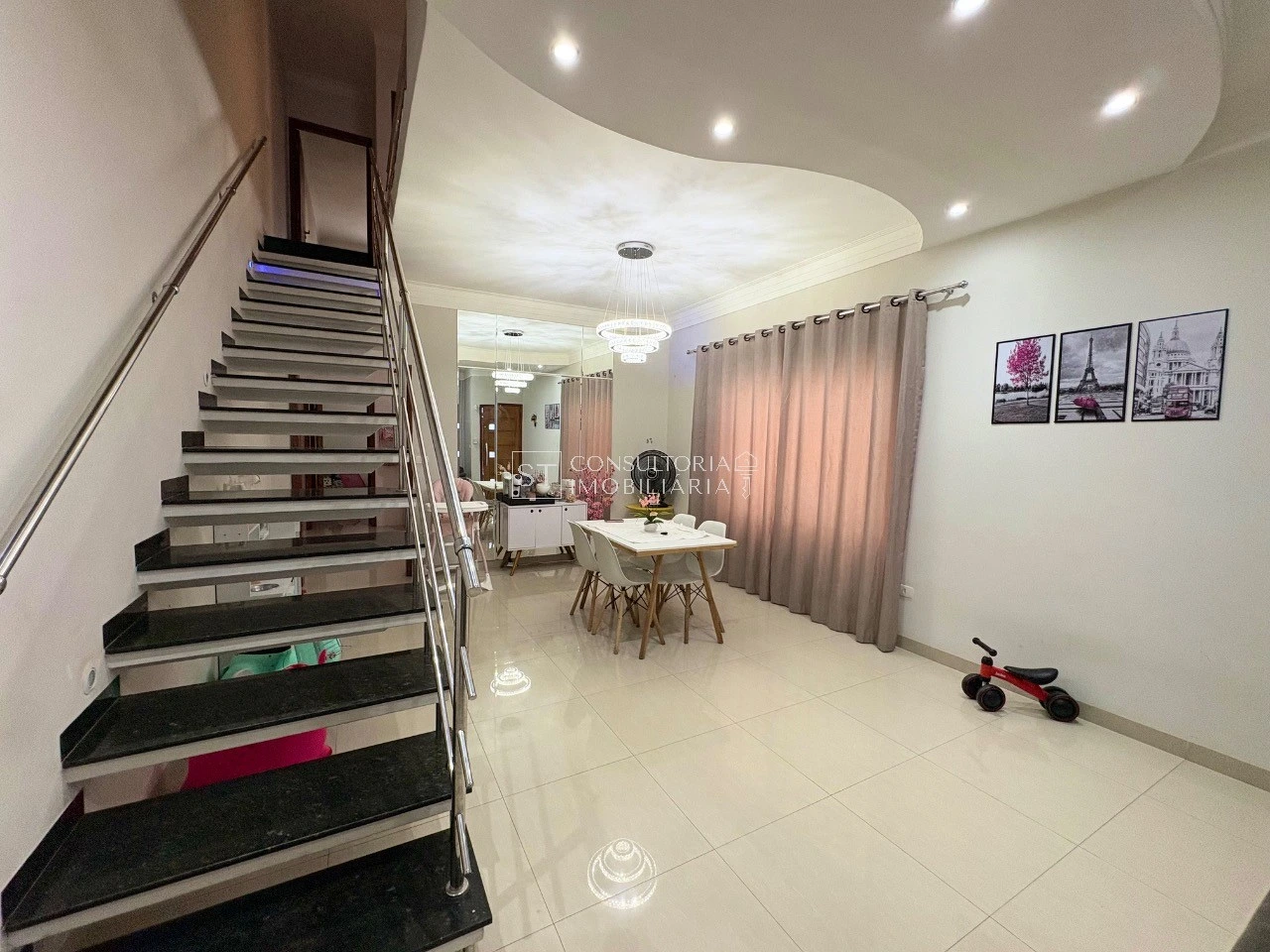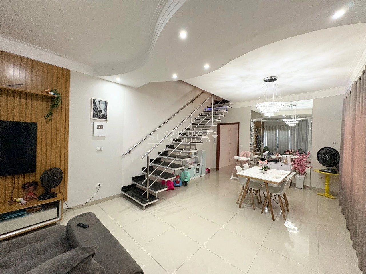 Sobrado com 194 m² de área total, oferecendo 4 dormitórios, sendo 2 suítes, 4 banheiros modernos, 1 espaçosa sala de estar e 2 vagas de garagem.