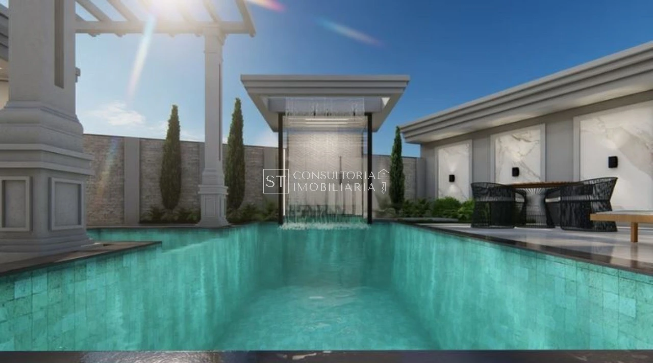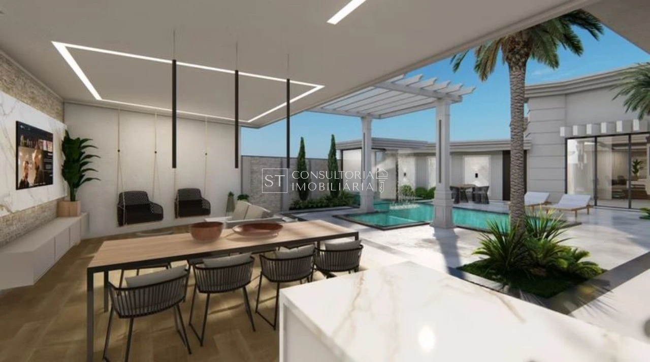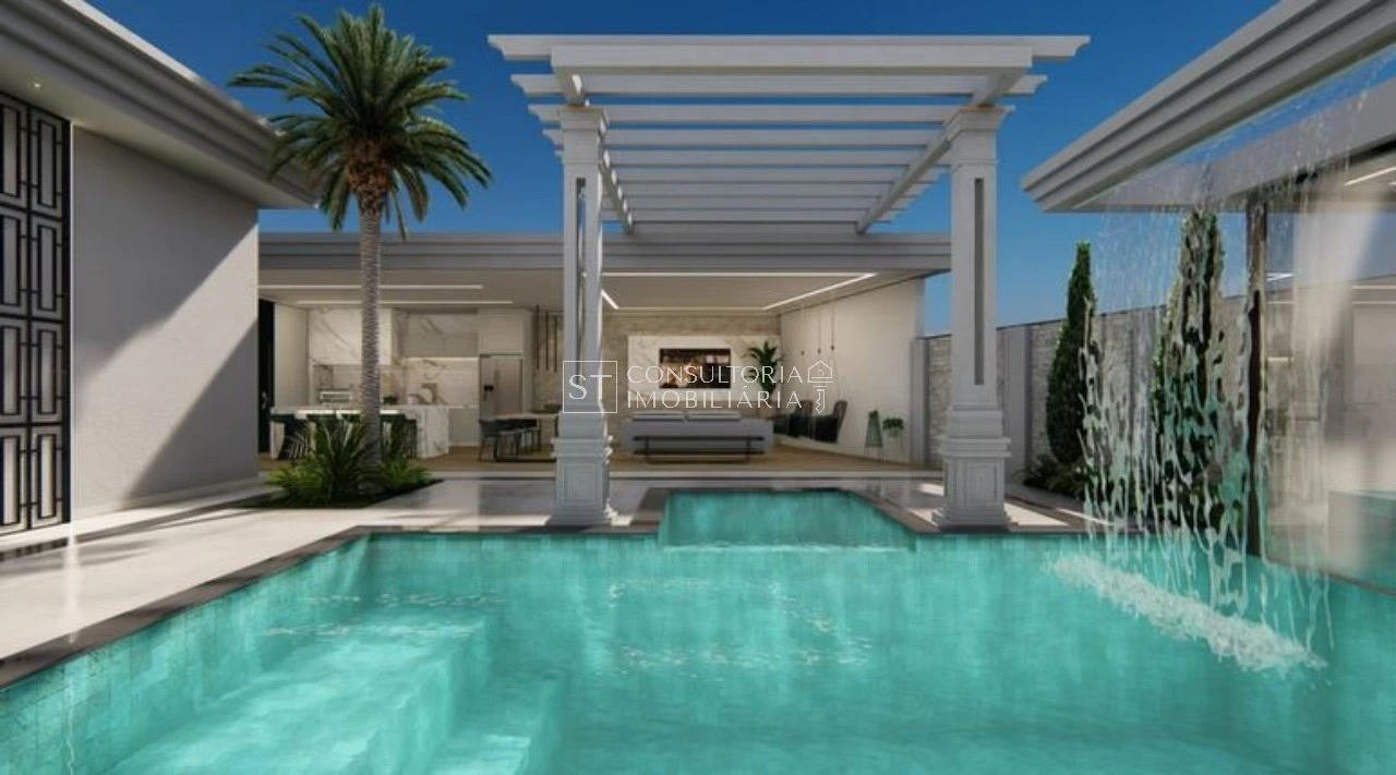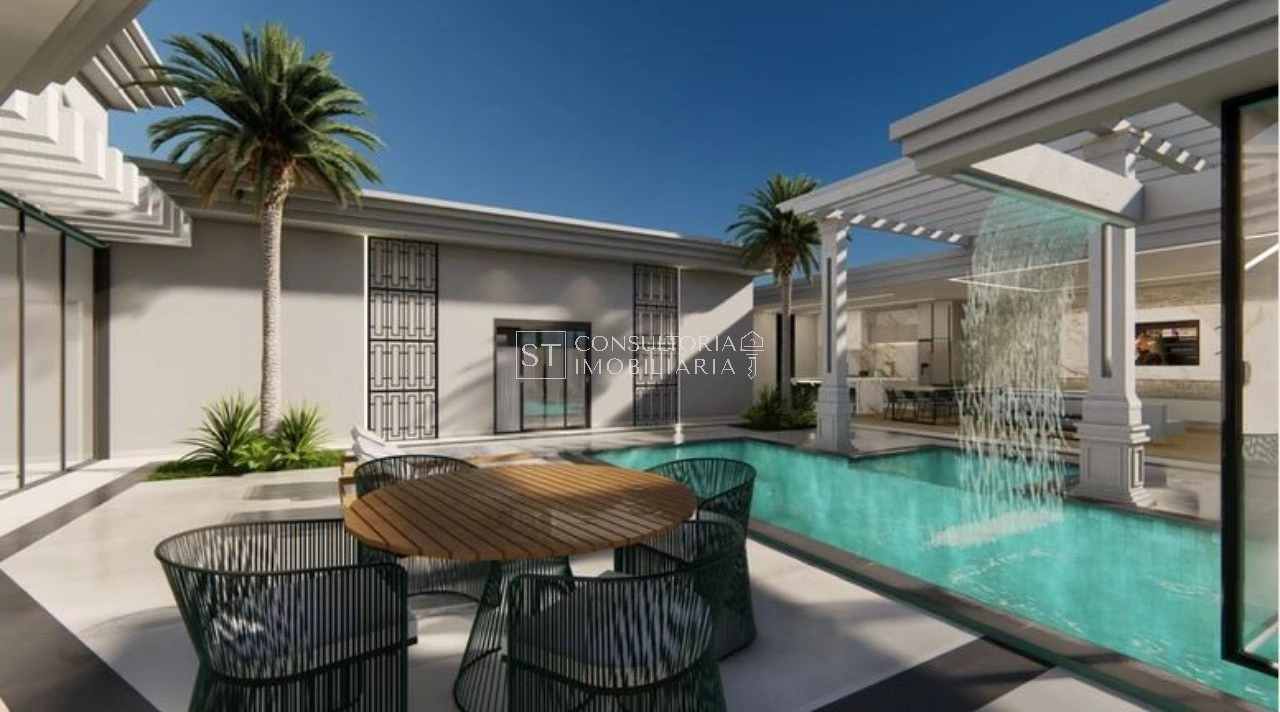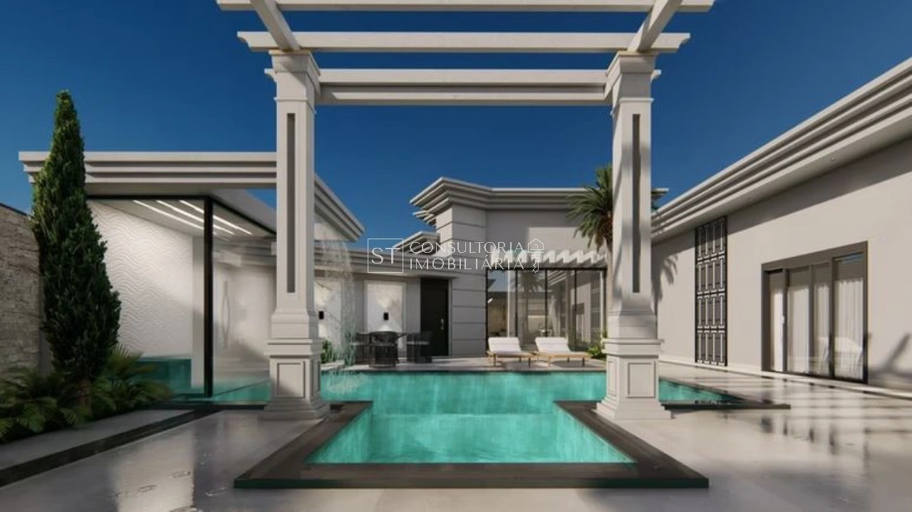 Com uma arquitetura térrea de pé direito alto, os ambientes integrados no living convidam a família a se reunir em uma sala de TV e jantar ampla, junto à cozinha que possui uma despensa para auxiliar no dia-a-dia. Os ambientes íntimos ficam reservados e, 3 suítes com amplos closets, oferecem privacidade e conforto. A suíte master, com portas de vidro com vista para a piscina, é um destaque especial.