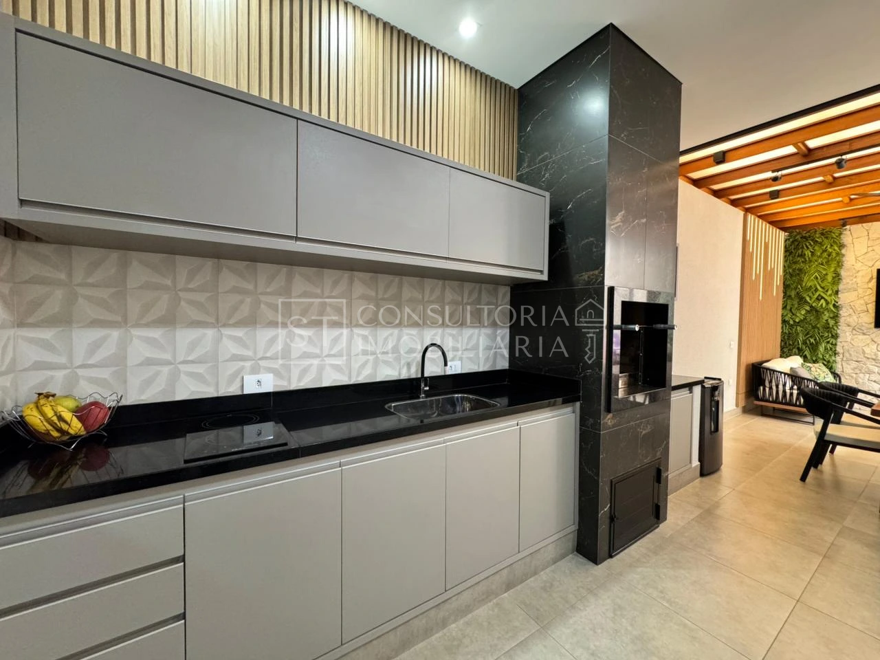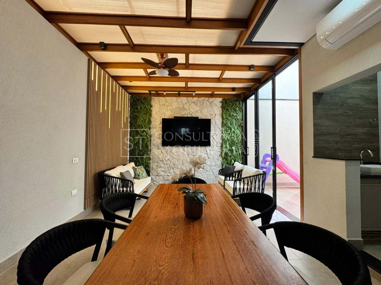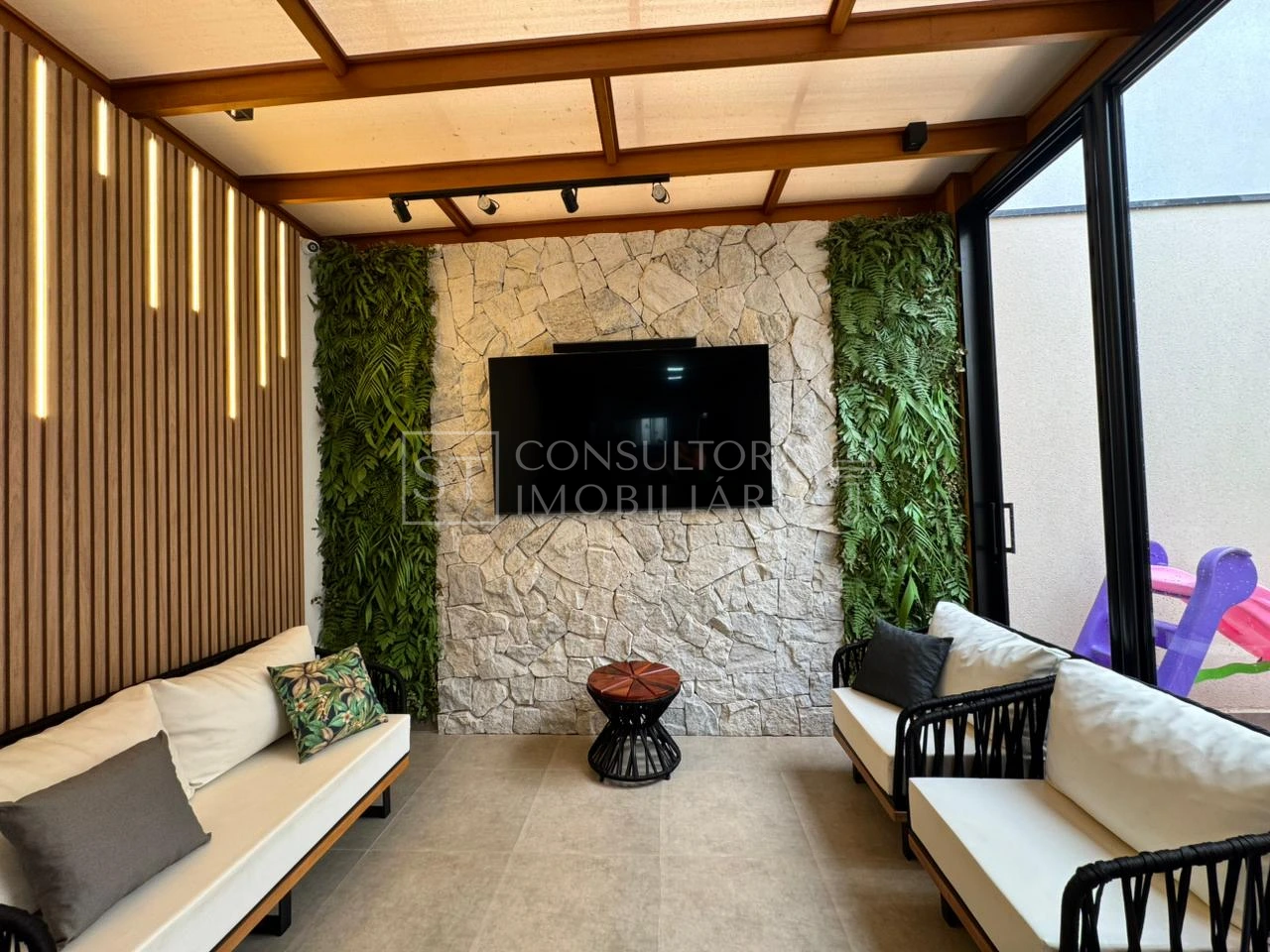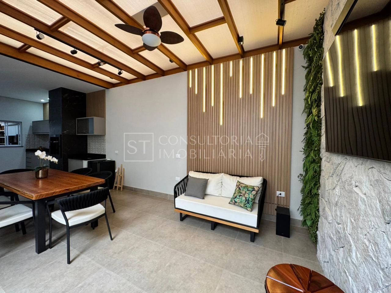 Espaçoso quintal com lavabo, churrasqueira e espaço gourmet e lavanderia.