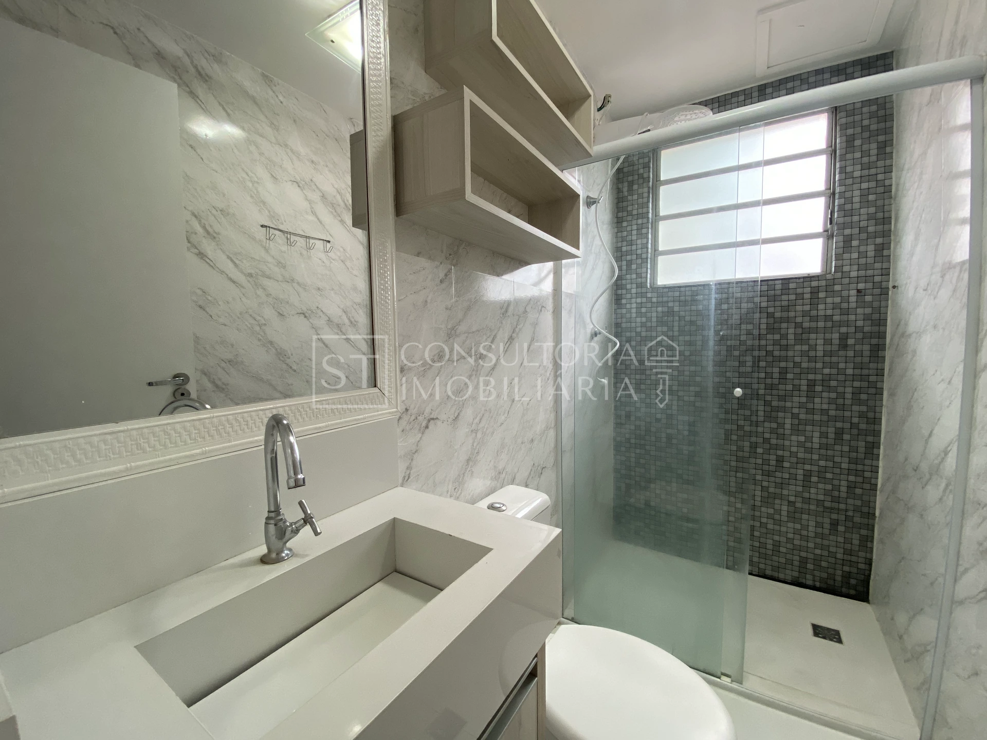 Apartamento de 53m², 1°andar, com 2 quartos, banheiro social, sala de jantar e tv integrados e cozinha com lavanderia integrada.