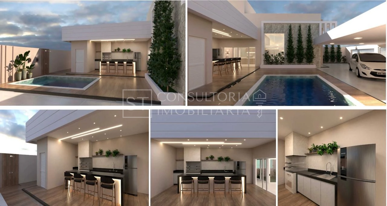 Casa com 3 dormitórios, sendo 1 suíte, sala de estar integrada à sala de jantar e cozinha, pé direito alto de 4,60 metros, área gourmet com ilha, churrasqueira, 2 banheiros sociais e piscina aquecida com hidromassagem e controle via Alexa.