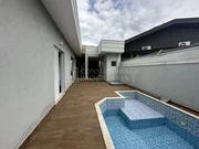Espaçoso quintal com lavabo, churrasqueira e espaço gourmet, piscina e garagem para 2 carros.
