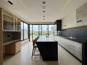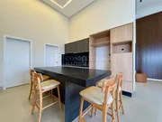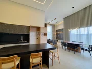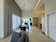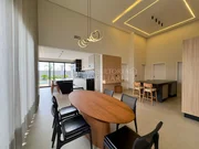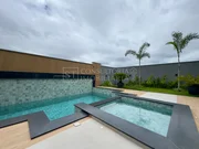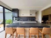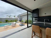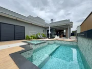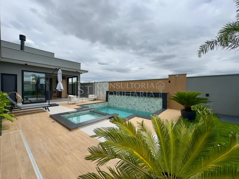 Casa térrea com arquitetura moderna, ambientes bem distribuídos. Possui 3 suítes amplas, sendo a master com jardim de inverno, closet e vista para a piscina. A área social conta com salas de estar e jantar integradas, pé-direito alto e excelente iluminação natural. A cozinha é planejada, com marcenaria sob medida, despensa e acabamentos sofisticados, além de escritório ideal para home office.