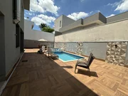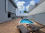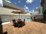 Espaçoso quintal com banheiro completo, churrasqueira e espaço gourmet, piscina.